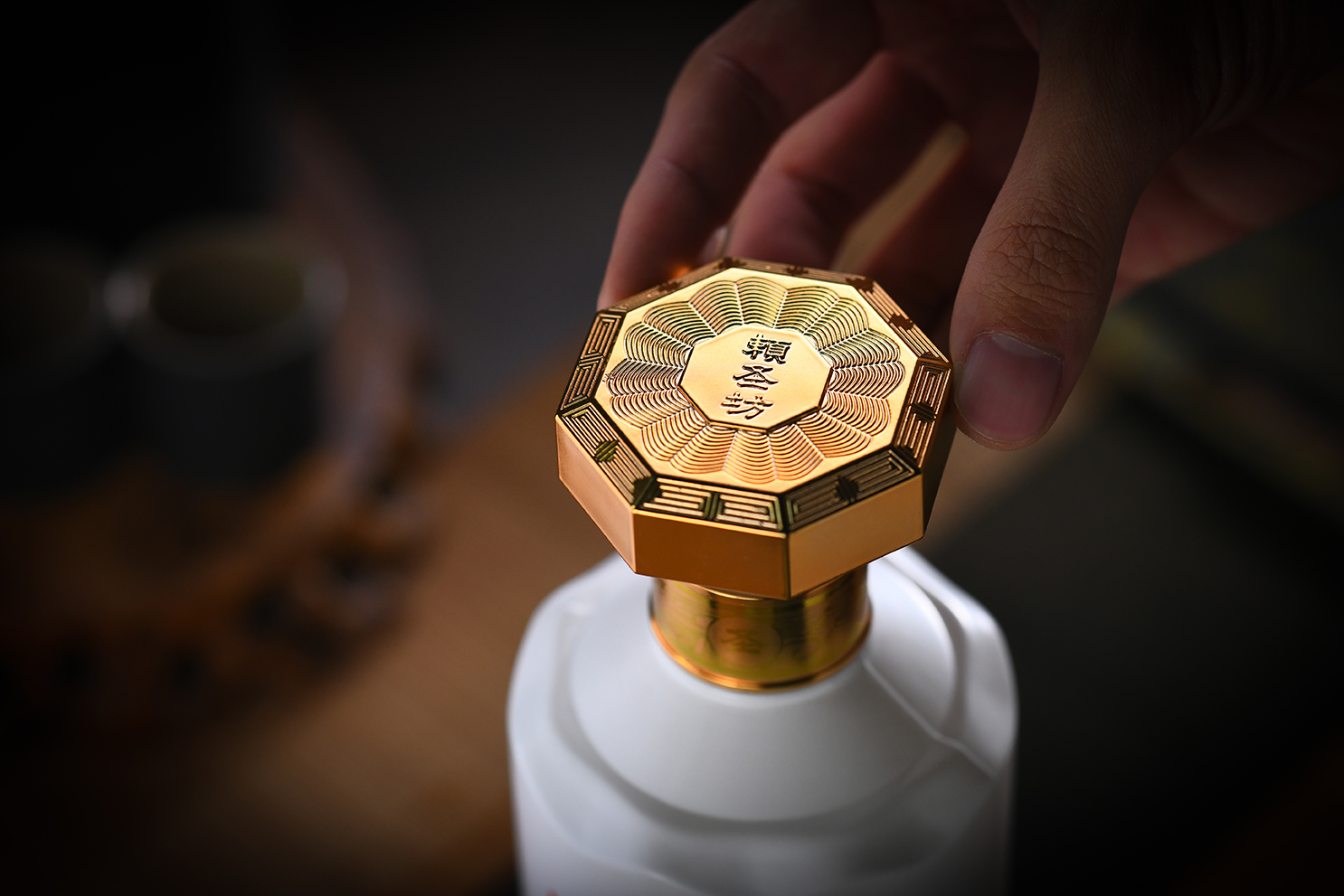 瓶颈以烫古铜金铸就酒坊场景插图,瓶肩以波浪效果合为成“莲花”造型,古朴典雅,致人阔达、开阔之感,暗喻赤水河的“水”元素与圣洁的内涵。烫古铜金的主体字与烫红金的印章更添传统意韵。表达出了赖氏人匠心不变,传承酱酒之魂的初心。